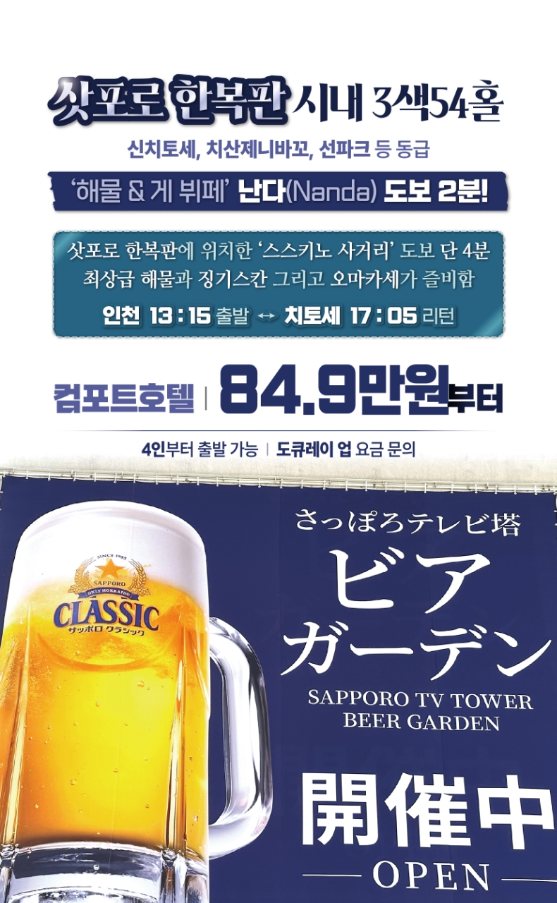 삿포로 클래식 맥주는 북해도에서만 마실 수 있어요. 스스키노 사거리에서 도보로 약 10분 정도 걸으면, 삿포로 TV 타워를 구경할 수도 있어요. 삿포로 하이볼은 시원하고 환상적인 맛을 자랑해요. 다양하고 풍부한 먹거리와 볼거리 등을 함께 즐길 수 있는 삿포로 실속 3색 골프여행 어떠세요?