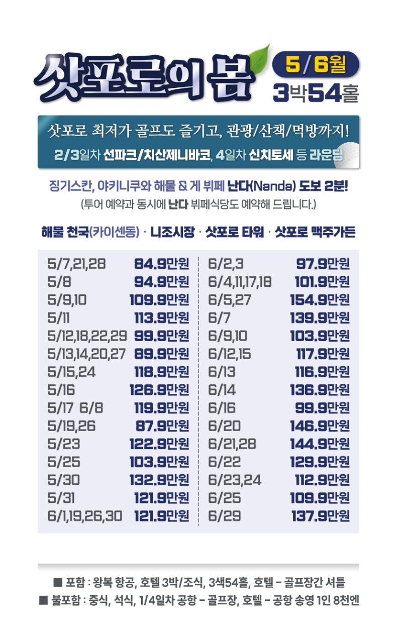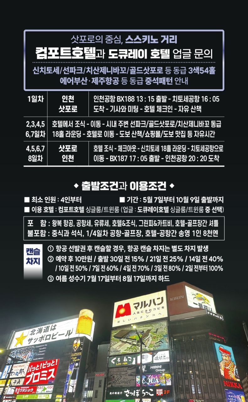 2024년 하계 시즌에 출시된 삿포로 실속 3색 골프투어 패키지 상품 이용 기간은 5월 7일부터 10월 9일 출발까지 가능해요. 최소 4인 출발이 기준이고, 2인 출발 시 사전 문의가 꼭 필요해요. 컴포트 호텔보다 더 훌륭한 '도큐레이 호텔'도 잘 준비 되었어요.