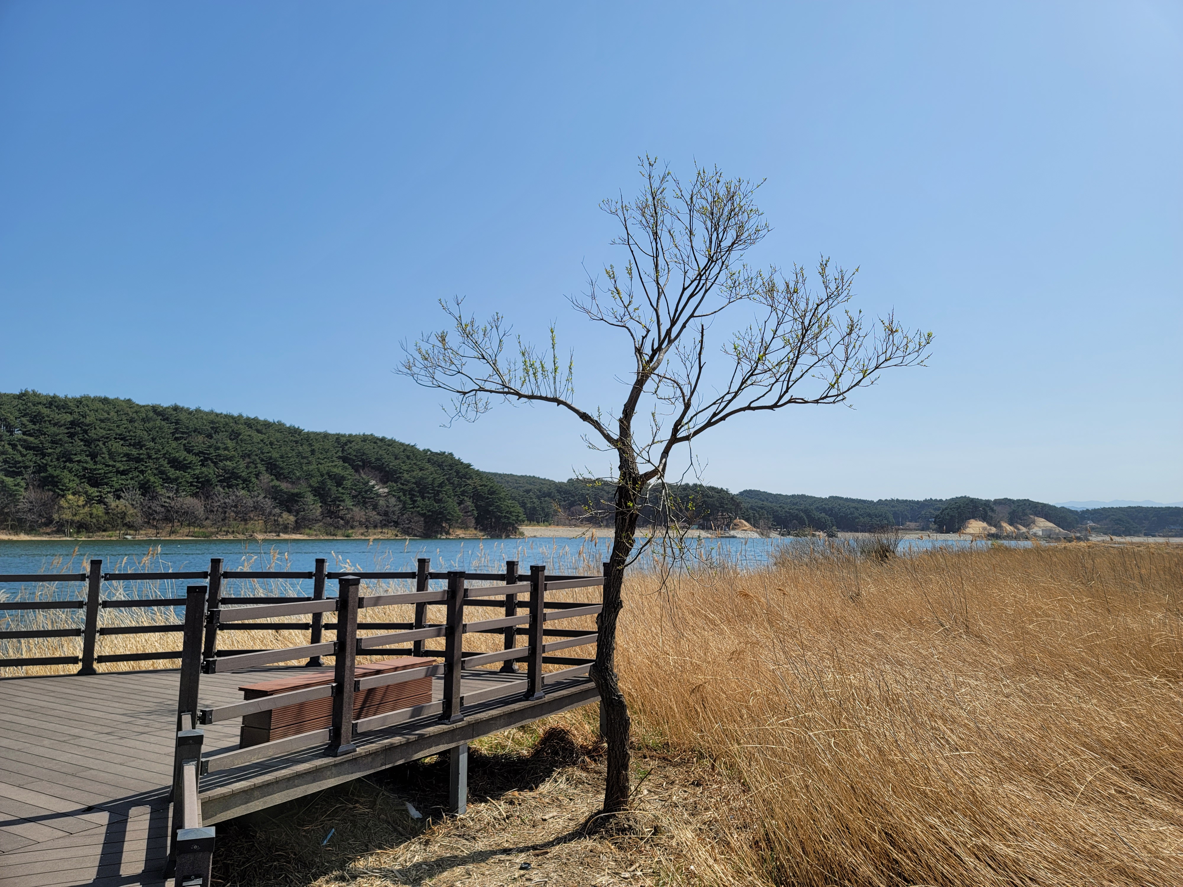 남대천 수변가에 있는 갈대숲 안쪽에 나무데크로 탐방로가 설치되어 편안한 산책로를 제공해요. 주변 풍광이 좋아 걷는 기분까지 좋아지는 최상의 환경을 자랑해요. 중간중간 잠깐 앉아서 쉴 수 있는 벤치도 잘 마련 되었어요. 걷다 쉬다를 반복하면서 자연스럽게 힐링되는 곳이 바로 '남대천 양양 생태관찰로'가 아닐까 생각해요.
