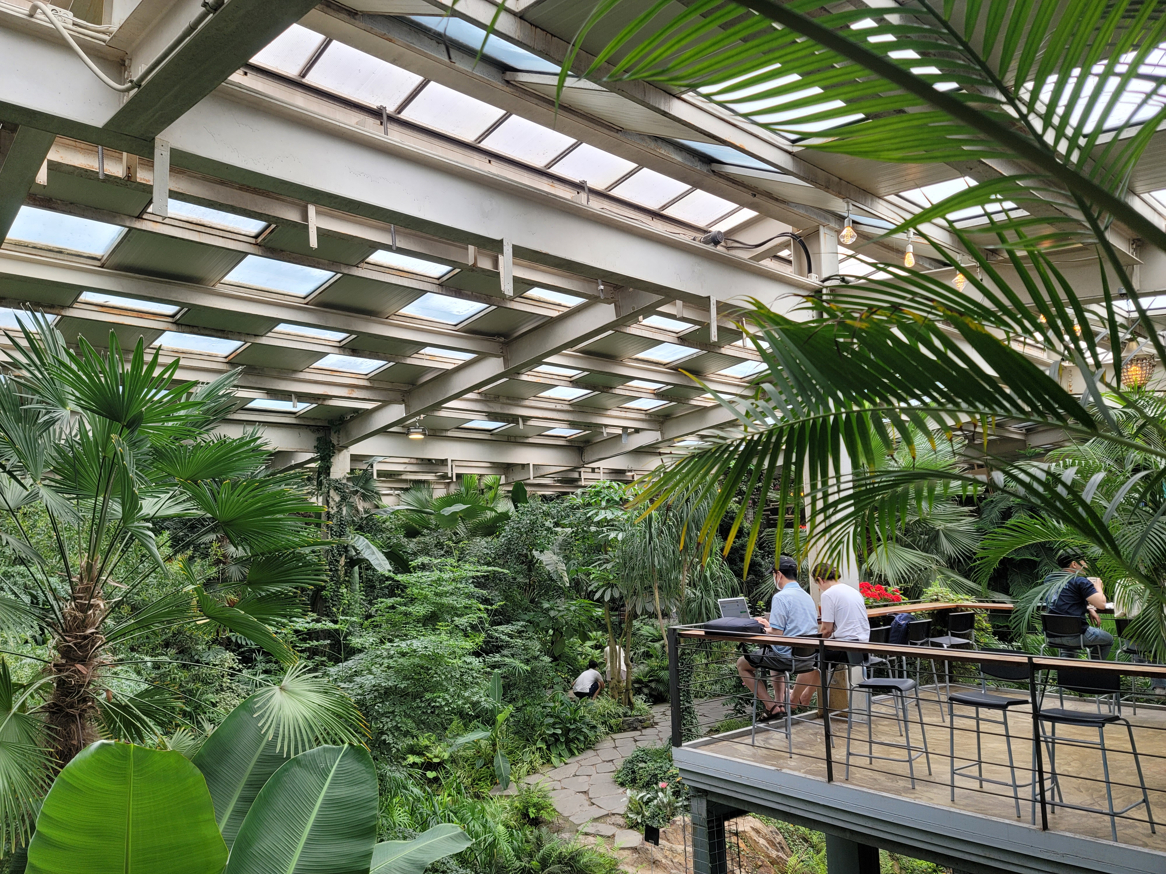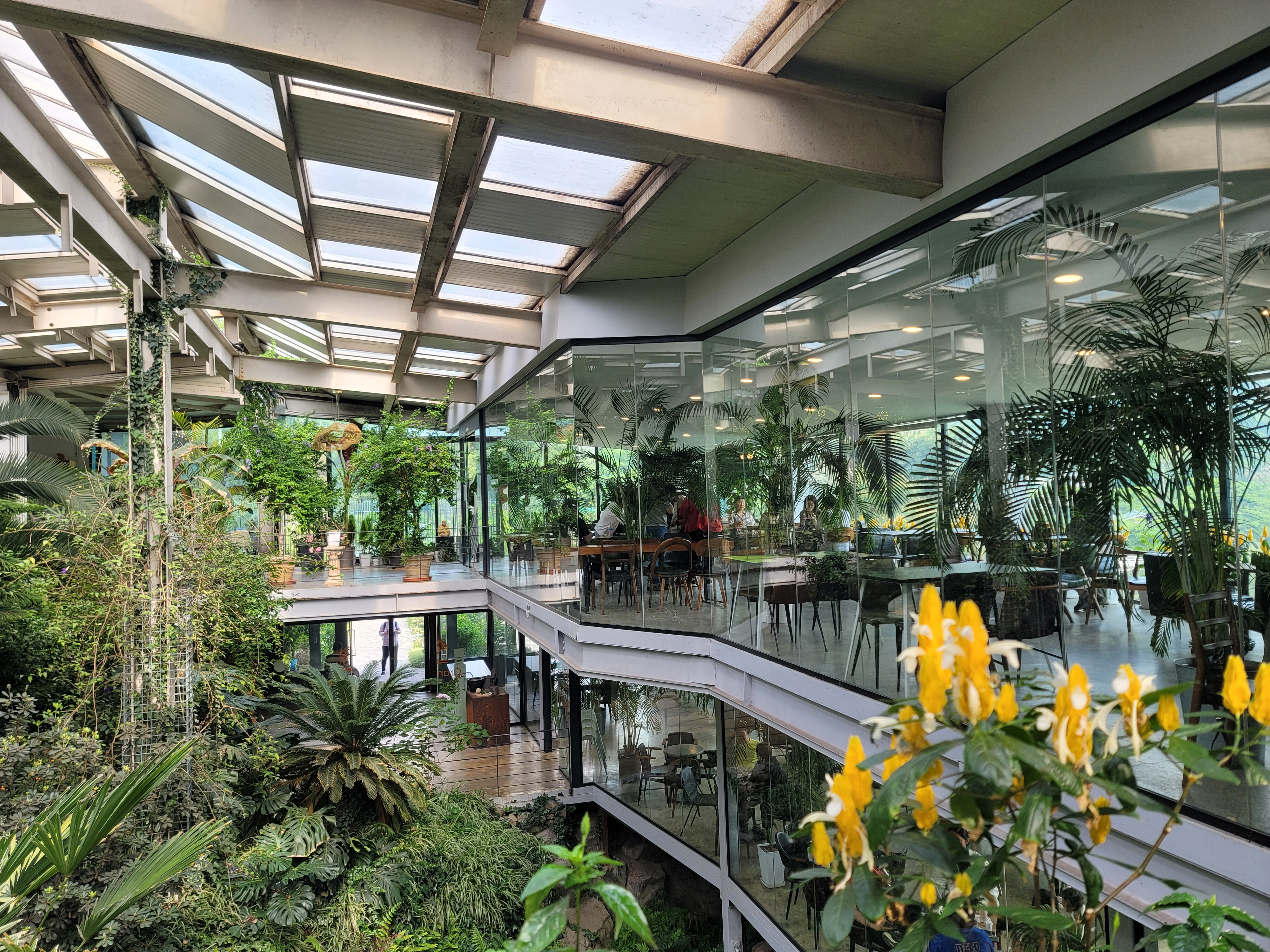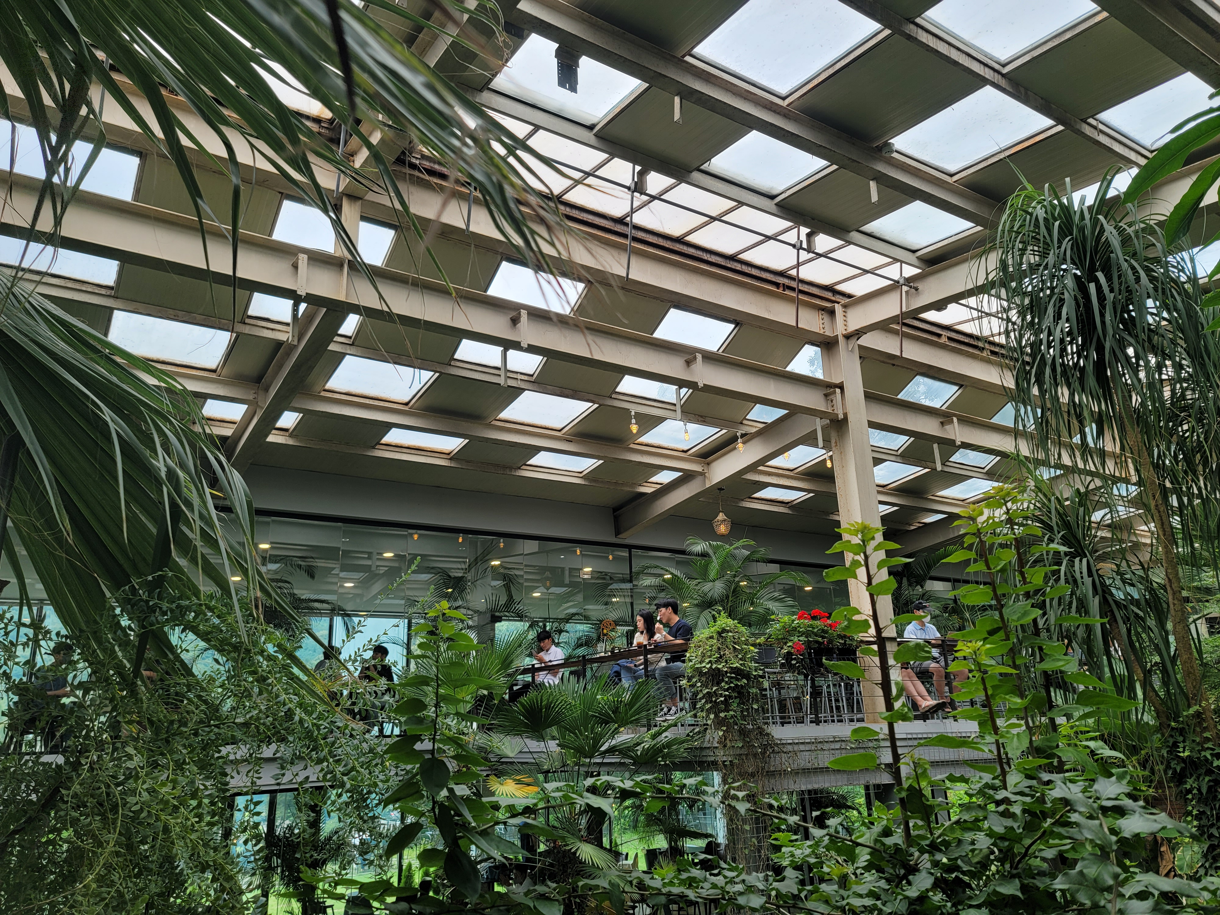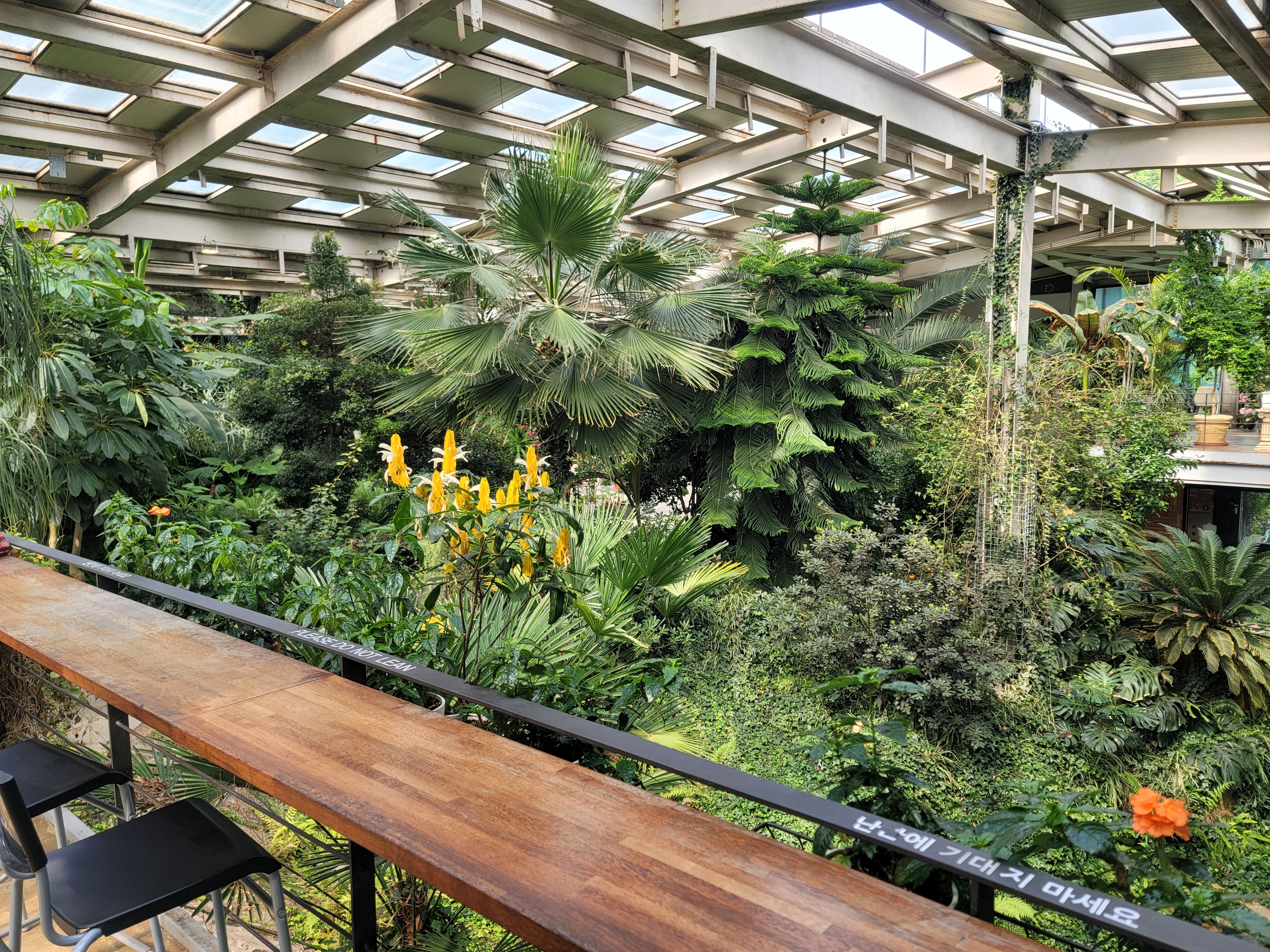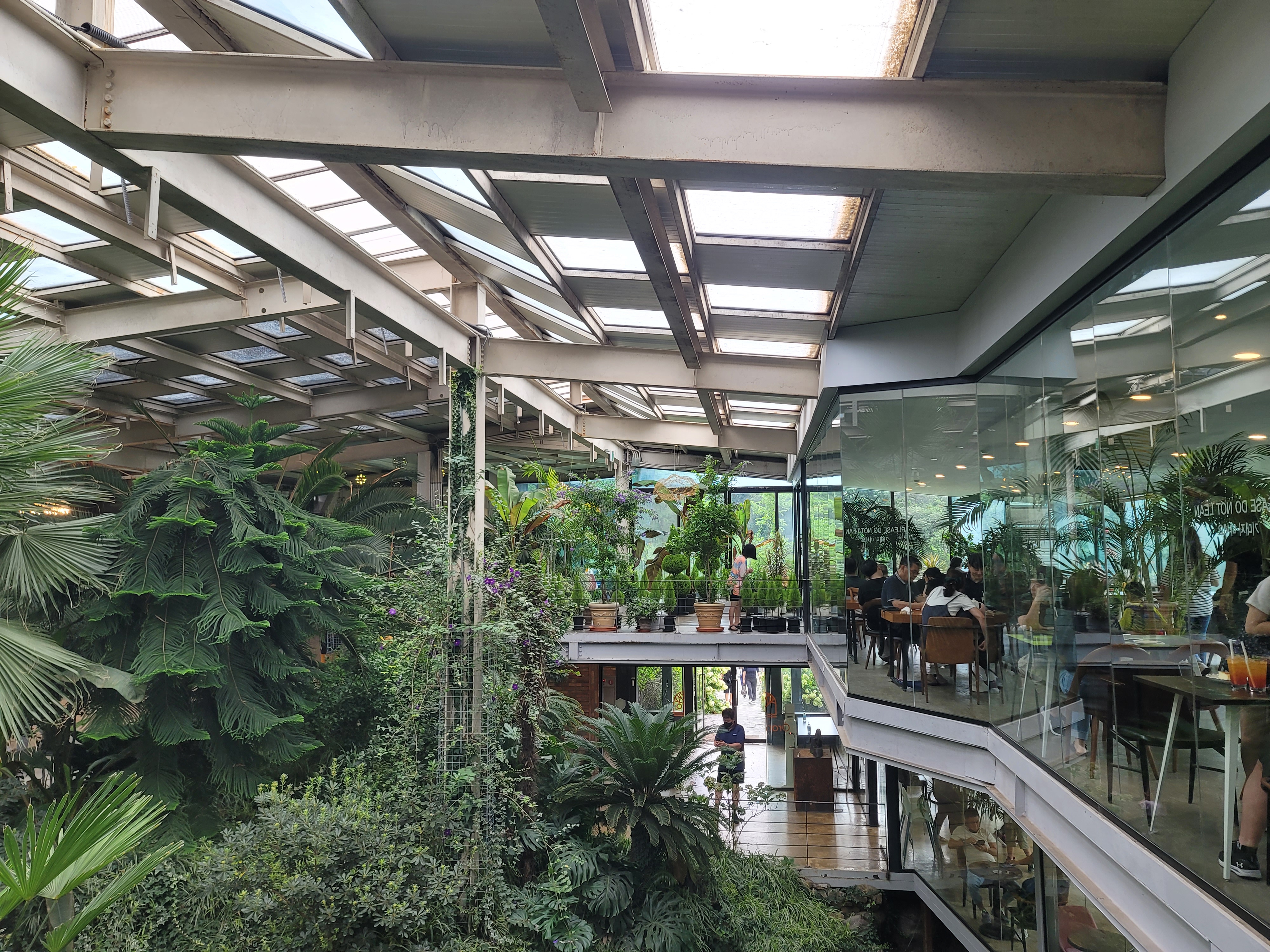 1층과 2층 공간 모두는 전면에 통유리로 제작 되었어요. 초록초록한 풀내음은 물론 자연친화적인 풍경을 감상할 수 있어요. 음료나 케이크, 피자 등을 즐기면서 아름다운 자연 풍광을 만끽할 수 있어요. 특히, 울창한 식물원을 내려다볼 수 있는 2층 테라스 뷰는 정말 예술 그 자체인 것 같아요.